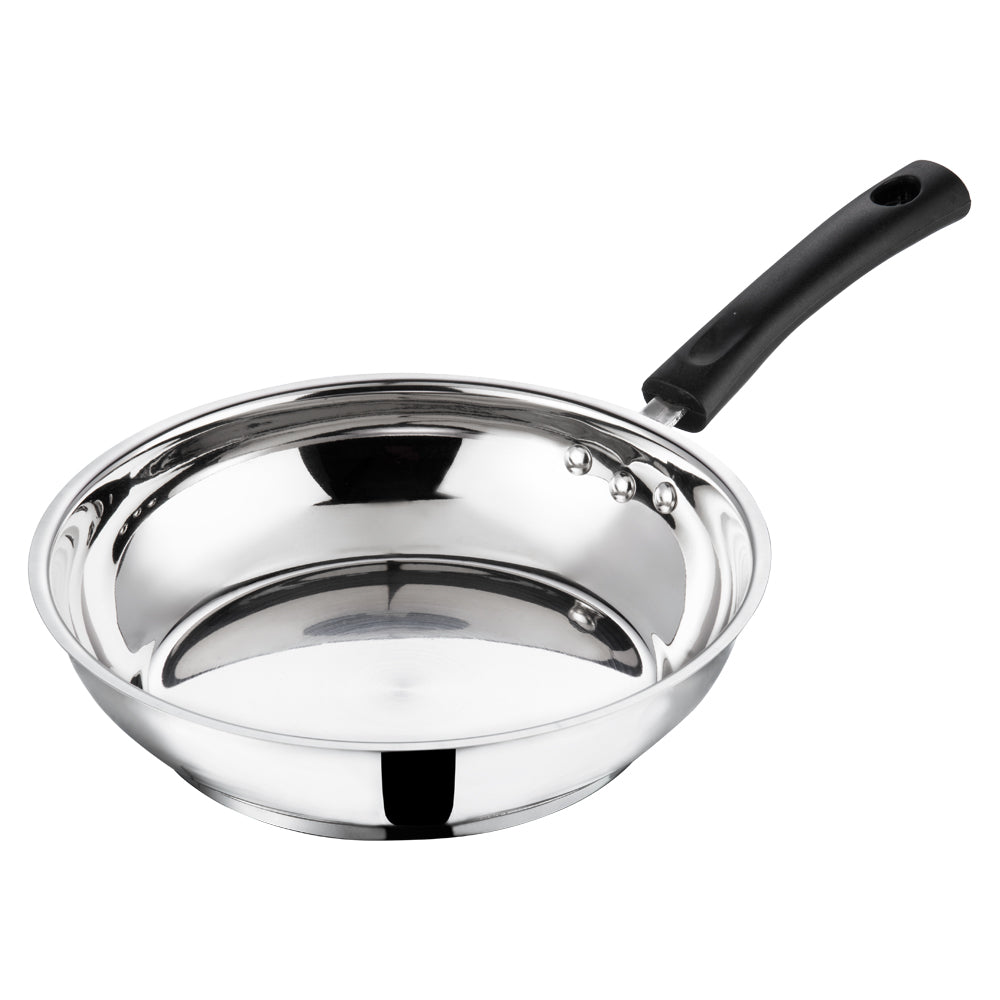 Vinod stainless steel frypan is the way to healthy frying and more. The robustly designed base facilitates even heat distribution so your food cooks throughly without burning.