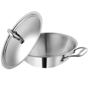 The third layer is made of AISI 430 grade magnetic stainless steel for induction compatibility. The kadai can be used for sauteing, deep frying, and for preparing curries and gravies.