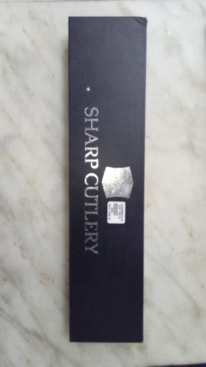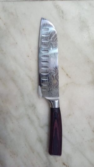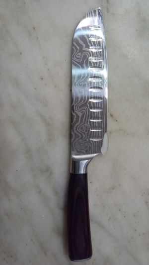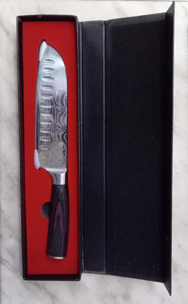 A knife forged with several metals to hold the sharpness of the blade. The wooden handle makes it comfortable to hold and beautiful to look at. The balance of the knife is premius as well as its usage.