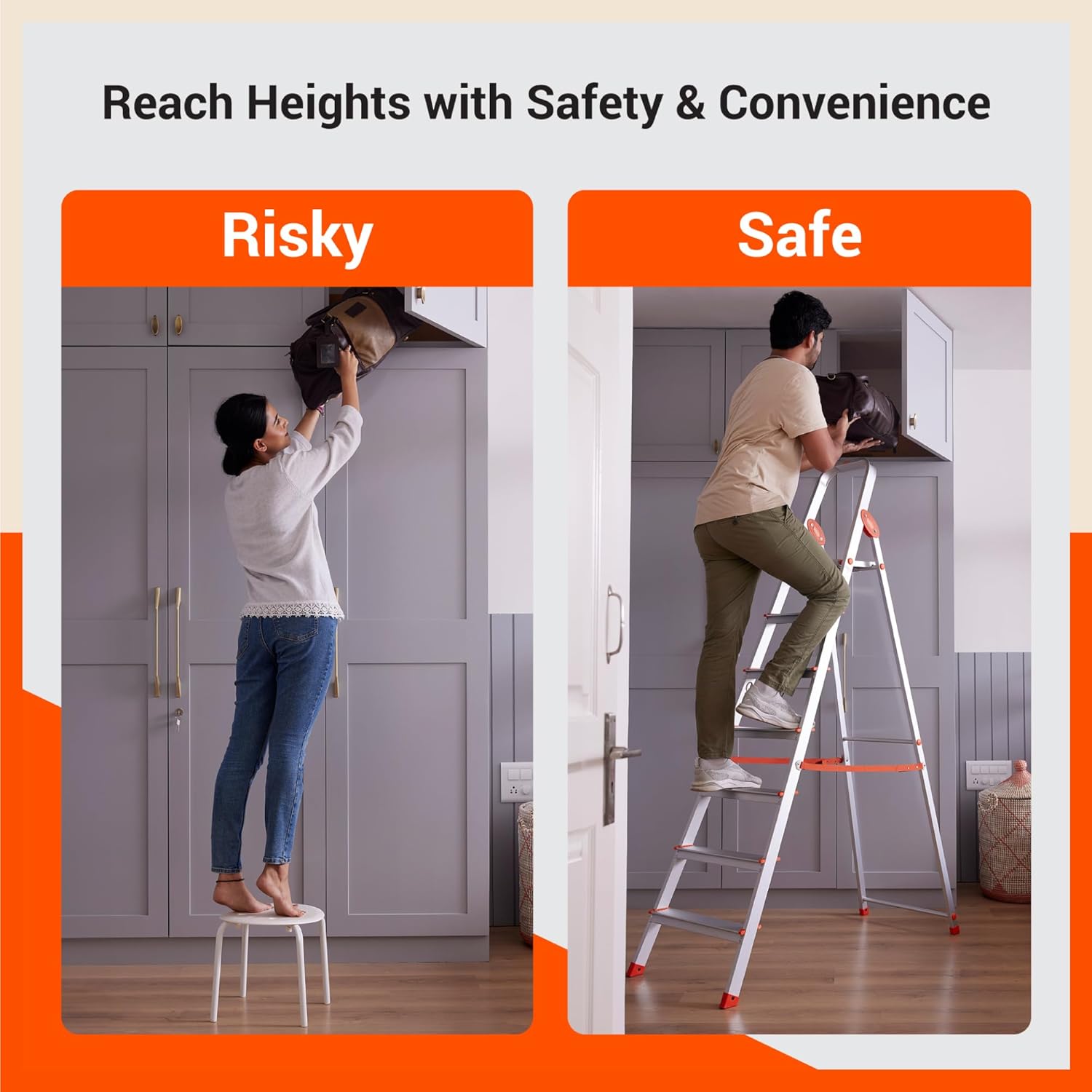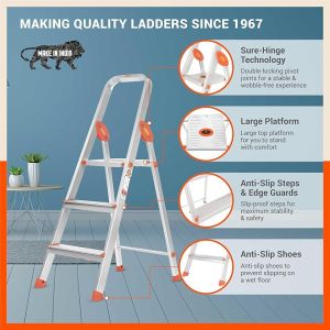 - SLIP-PROOF STEPS WITH EDGE GUARDS: Our aluminium ladder for home 3 steps has every step designed with rows of parallel ridges that give your feet a steady, slip-free surface during use. They also feature precision engineered edge guards to maximise safety.