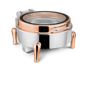 Home/SERVEWARe/BANQUET/ANTHEM5-MEC 43FGTQ RG/SS/RG 7LTR Round Chafer With cover control mechanism Glass Window. With full covered stand, Tall Height. With Rose Gold Stand Stainless Steel Base and Rose Gold Lid Finish.Can be used with Induction Heater, Fuel burner orHeating Plat