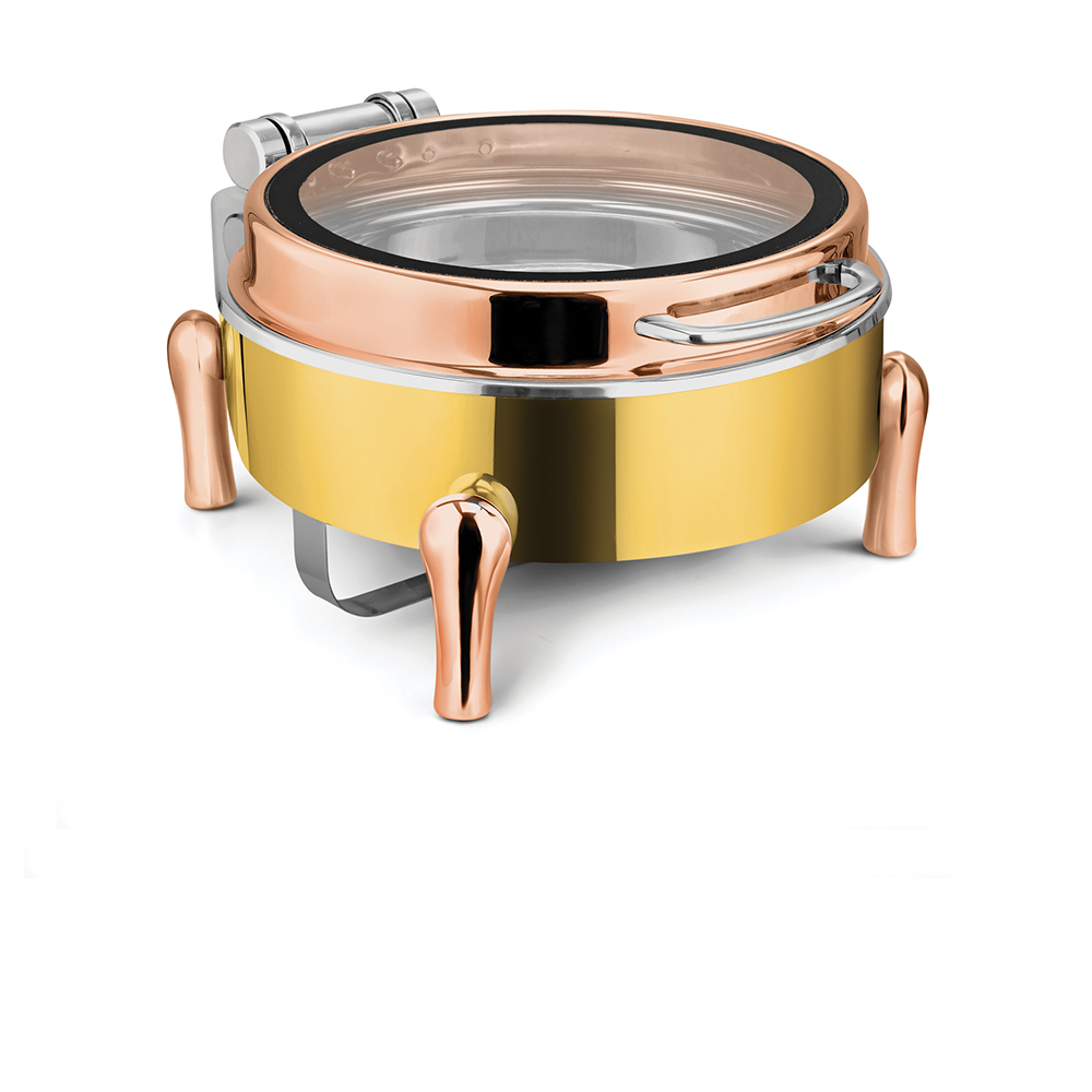 Home/SERVEWARe/BANQUET/ANTHEM5-MEC 49FGTQ RG/AU/RG 7LTRRound Chafer With cover control mechanism. With Full Glass Window. With Rose Gold Stand, With full covered stand, Can be used with Induction Heater, Fuel burner or Heating Plate.(Induction Heater/ Heating Plate Not Included