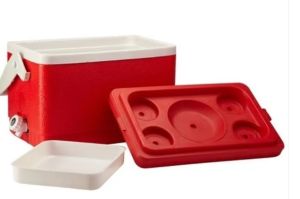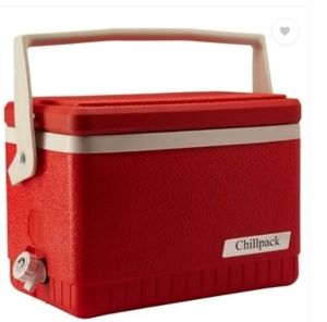 An insulated box with a handle that locks the lid in place and avoids spill during travel. Size large enough to store at least 6 water/beer bottles
