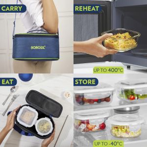 - BOROSILICATE GLASS: Borosil lunchboxes are crafted from premium borosilicate glass, known for its extreme temperature resistance and durability, making it perfect for daily use and commuting.