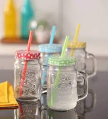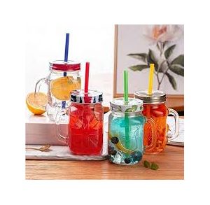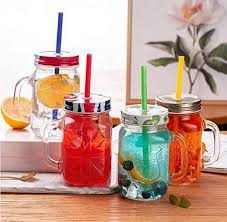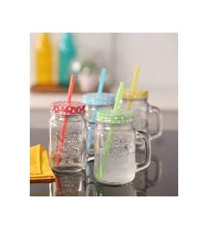 • HIGH QUALITY JARS: GLASS mason jars with handles accented by colored metal lids and Reusable Straws; USE: Fill with your favorite drinks, cocktails, juices, shakes, smoothies etc.